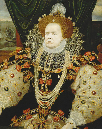 Дизайнер Mихал Краутхаммер в своих коллажах воплощает эту идею в жизнь: он берет портреты королевы Елизаветы и других членов британской королевской семьи и заменяет их лица на лицо Дональда Трампа.