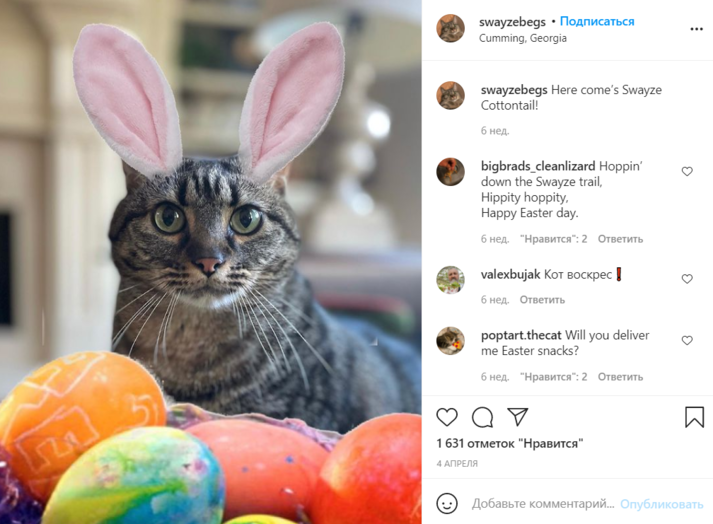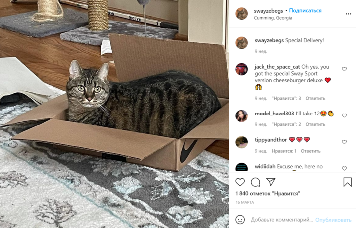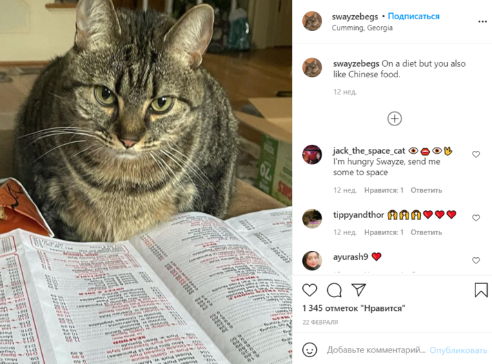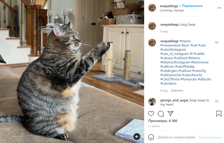 Пятилетняя кошка Суэйзи живет в американском штате Джорджия вместе со своей хозяйкой Эбби Нельсон. В инстаграме у нее более 32 тысяч подписчиков, а все потому, что она невероятно большая — ее вес составляет 7,5 килограмма.