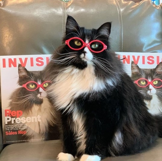Трюфель взяли на работу в качестве моральной поддержки для маленьких клиентов оптики. Кошка совсем не против человеческого внимания и спокойно носит на себе оправы для очков, демонстрируя их детям.