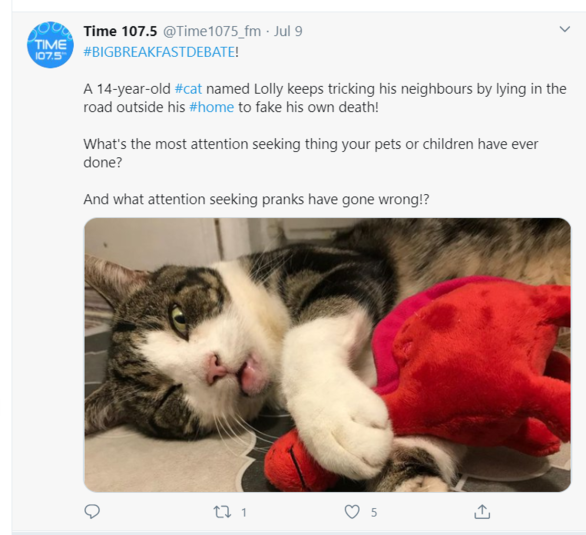 Кот Лолли любит валяться на шоссе с закрытыми глазами и высунутым языком, обманывая водителей, чтобы те приняли его за жертву автоаварии