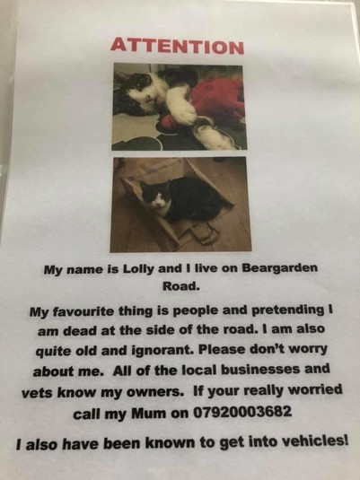 14-летний кот по имени Лолли обманывает соседей в Банбери на юго-востоке Англии, притворяясь бездыханным прямо посреди проезжей части.