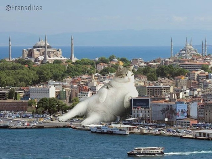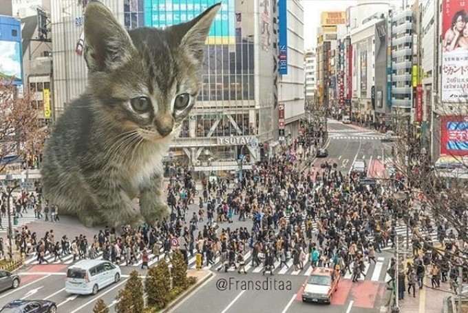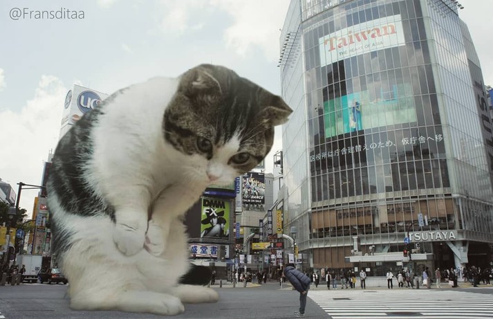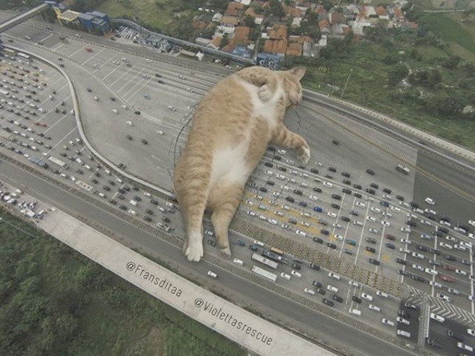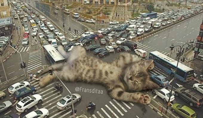 Индонезиец Франсдита Муафидин публикует на своей страничке в Instagram картинки, на которых огромные котята и толстые взрослые коты стоят или лежат на дорогах, мешая проехать автомобилям.