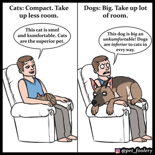 Теперь, как вы скоро увидите, этот комикс может быть немного предвзятым. Тем не менее, существуют веские аргументы в пользу решительной победы в битве с домашними животными: кошки умнее, чище и лучше заботятся о себе, это неоспоримые факты.