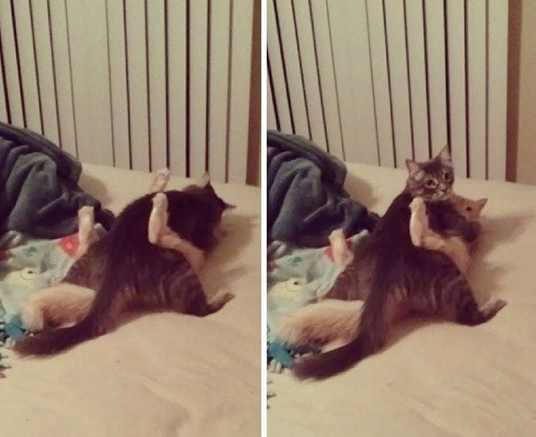«Чего? Мое! Надо! Не отдам!», «Какое изощренное злодейство», «Ну что тут скажешь?», «И вся жизнь проносится перед глазами кота», «Это чья лапа, а?», «Ты же и убежать с добычей не сможешь!», «Рыбаки! Но один нечестный…», «Ну, поймал. И что дальше?», - комментируют фото пользователи сети.