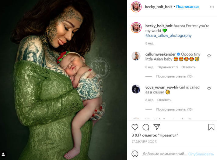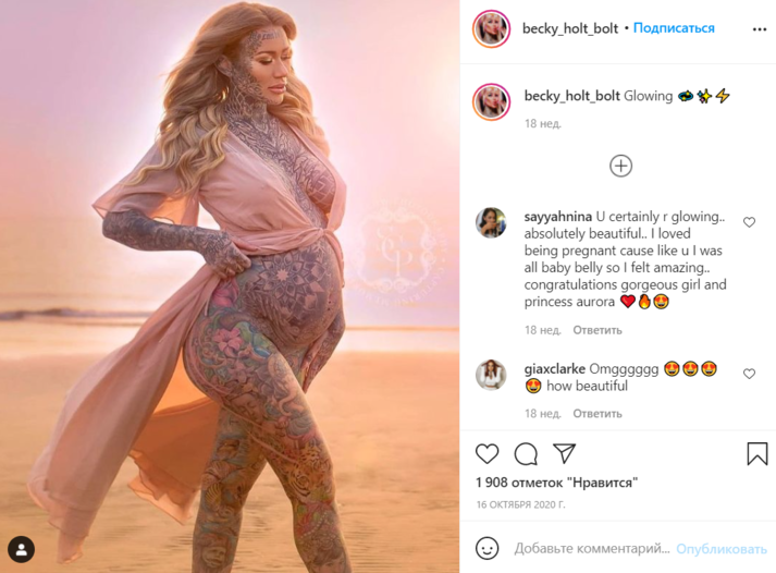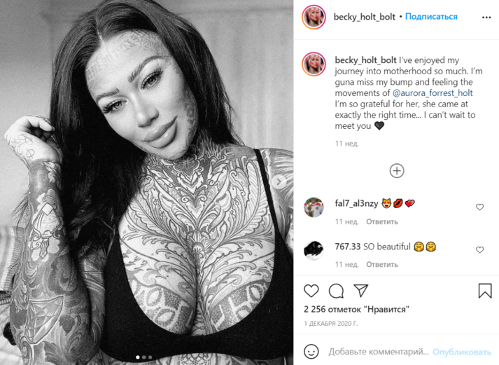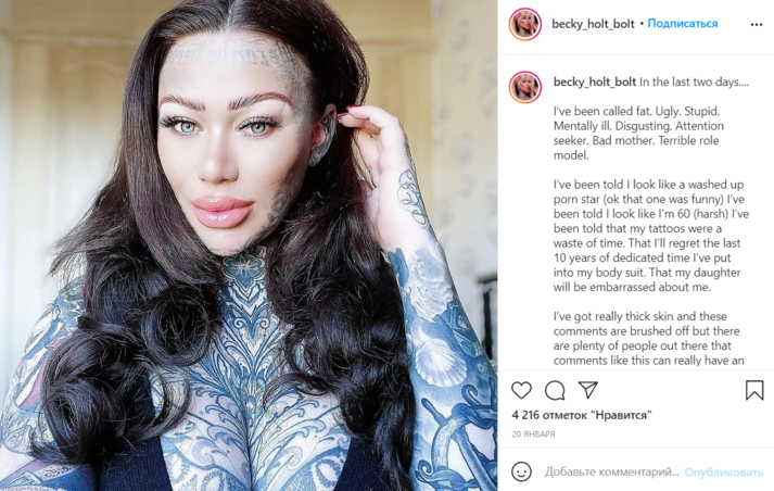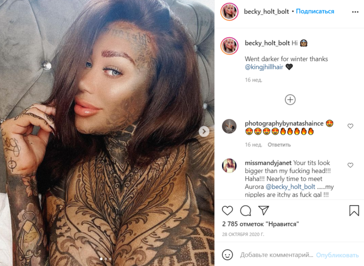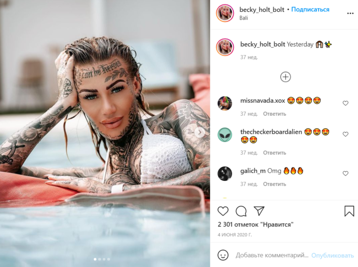 Мало кто оказывался в такой же ситуации, что и 33-летняя инста-модель Беки Холт из Чешира, Великобритания. Молодая мама с 2001 года начала увлекаться тату, и за двадцать лет она успела полностью забить все свое тело, потратив 35 тыс. фунтов. Сейчас Беки — популярная инстаграм-модель, которая пытается восстановить свой аккаунт в соцсети. Предыдущая версия смогла достичь отметки в 193 тыс. подписчиков.