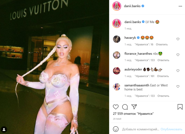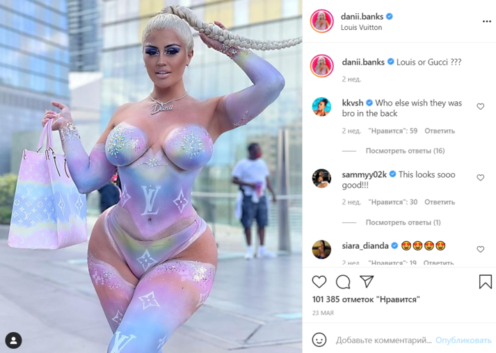 На инстаграм-аккаунт Дэни из США подписано почти 6 млн человек, и эту аудиторию уже сложно чем-то удивить. Девушка регулярно щеголяет в экстравагантных нарядах от именитых дизайнеров, но недавно она была вынуждена сделать ставку на себя. Бэнкс не смогла найти идеальное платье под свою новенькую сумку Louis Vuitton, поэтому… просто нарисовала его специальными красками.