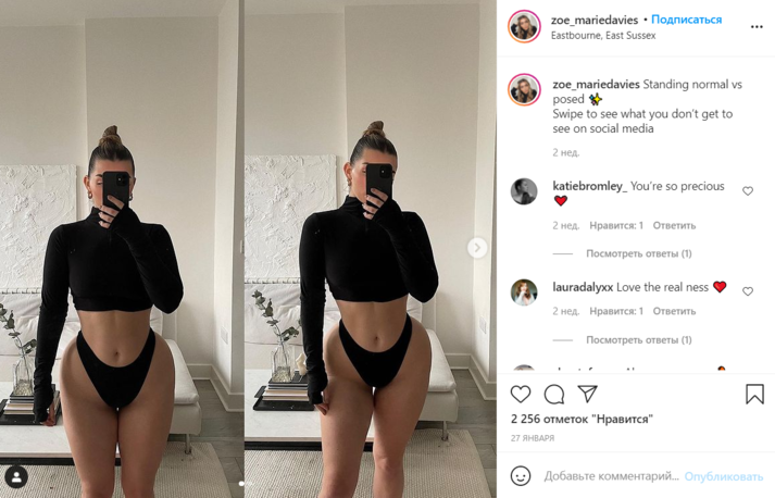 Зоуи Мари Дэвис из Великобритании ведет инстаграм-блог, в котором регулярно поднимает проблемы бодипозитива. Девушка часто публикует фотографии в нижнем белье, несмотря на то что ее тело не подходит под стандарты красоты, сложившиеся внутри соцсети.