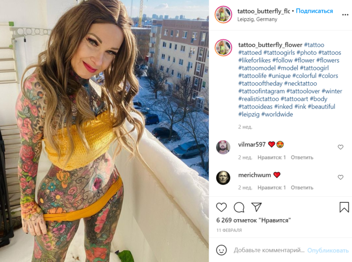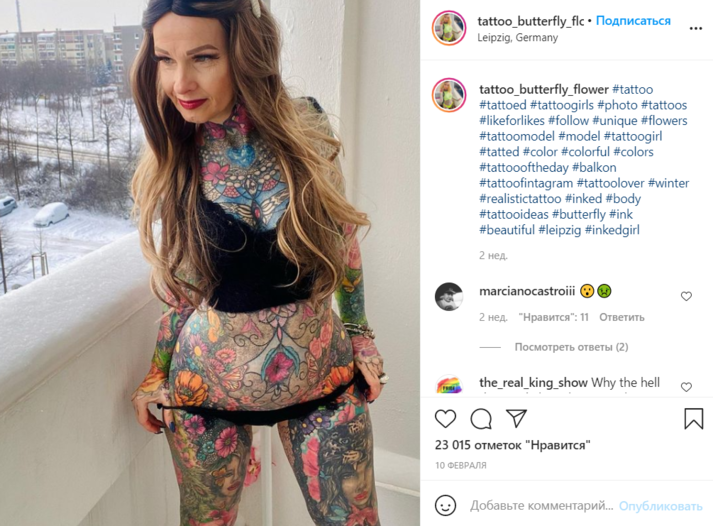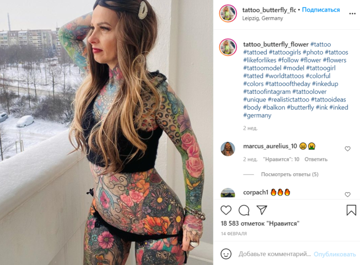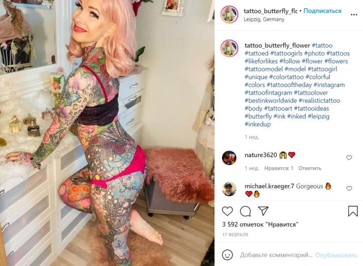 Согласно материалу, в общей сложности 55-летняя немка потратила на все рисунки, которые теперь нанесены на 90 процентов ее кожного покрова, около 35 тысяч евро. «Мне просто хотелось попробовать что-то новое», — пояснила она и добавила, что не жалеет ни об одном сделанном тату.