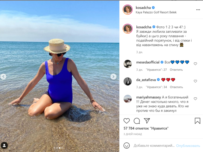 Ведущая программы «Светская жизнь» показала в фотоблоге новый пляжный кадр. На фотографии знаменитость появилась на фоне Средиземного моря, стоя на коленях на шезлонге, в розовом сплошном купальнике с изображением пояса, соломенной шляпке и черных солнцезащитных очках. Знаменитость показала большой живот на последних месяцах беременности.