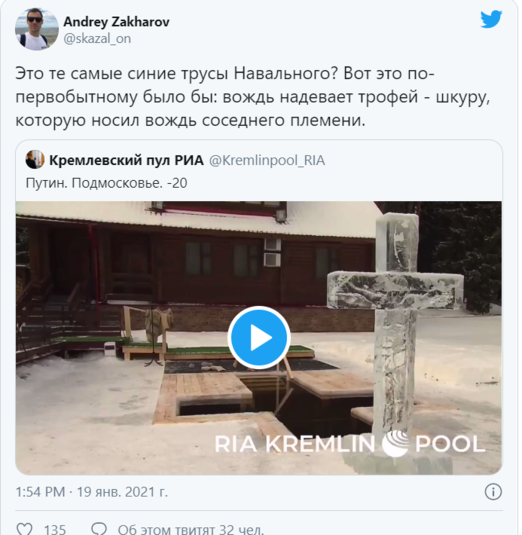 На кадрах лидер страны-агрессора трижды погружается с головой в ледяную воду. Для народного ритуала он выбрал синие плавки. Многие пользователи обратили внимание на трусы и отметили их цвет.