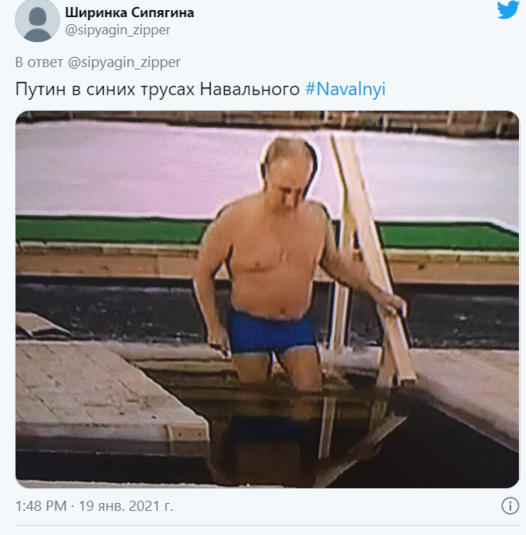 Российские пользователи Твиттера отметили, что на диктаторе были трусы такого же цвета, что и на российском оппозиционере Алексее Навальном в день его отравления, и решили, что это знак — и что Путин зачем-то надел знаменитые трусы Навального, которые сотрудники ФСБ отстирывали после отравления политика.