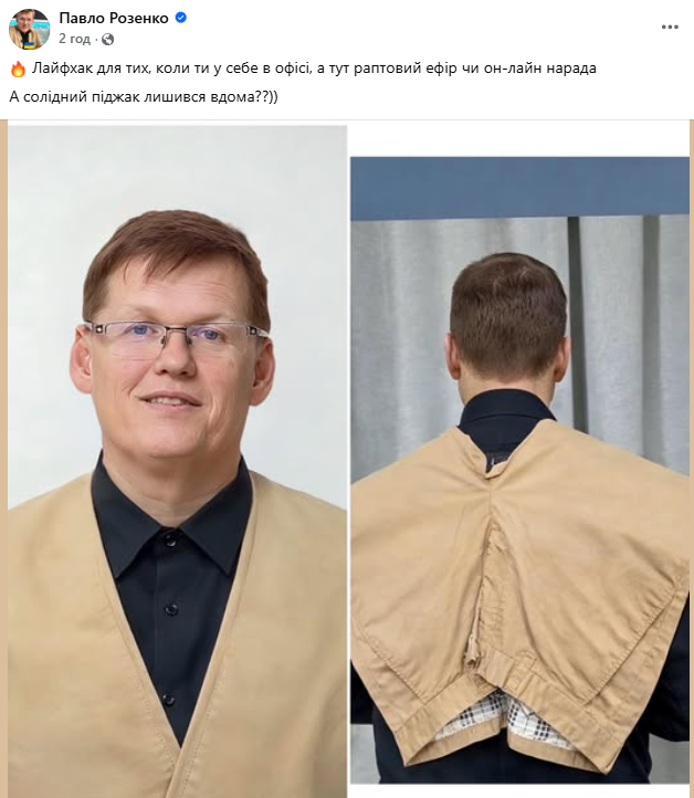 На світлині Павло Розенко стоїть у звичайній чорній сорочці, накинувши на плечі бежеві штани так, щоб вони імітували піджак. У підписі він жартівливо прокоментував такий «офісний прийом».