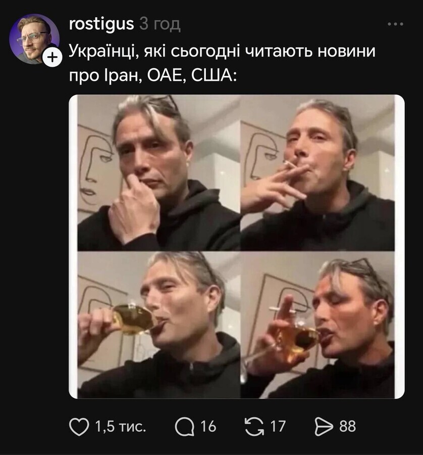 Світ шокований бомбардуваннями Дубая, які розпочав Іран 28 лютого, у відповідь на операцію США та Ізраїлю. Українці, які знають, що таке перебувати весь час під обстрілами, відреагували на новини мемами. Про це повідомляє «Главком».