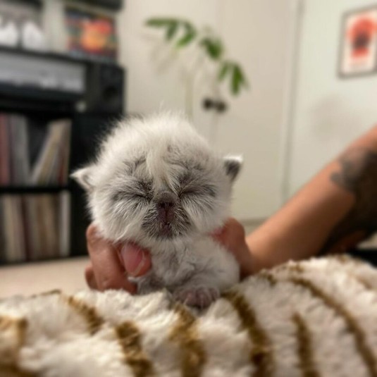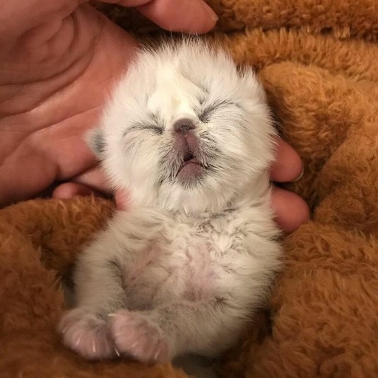 Доктора были уверены, что котенок не протянет и пары дней, однако отверженные усилия сотрудников приюта окупились. Недавно Дедушка впервые открыл глаза. Он показывает положительную динамику и успешно набирает вес. В будущем ему потребуется операция из-за расщелины неба, а на лапки придется наложить специальные шины, однако волонтеры уверены, что уникальный малыш сможет выжить