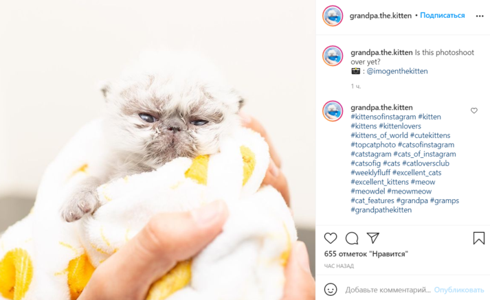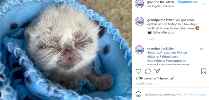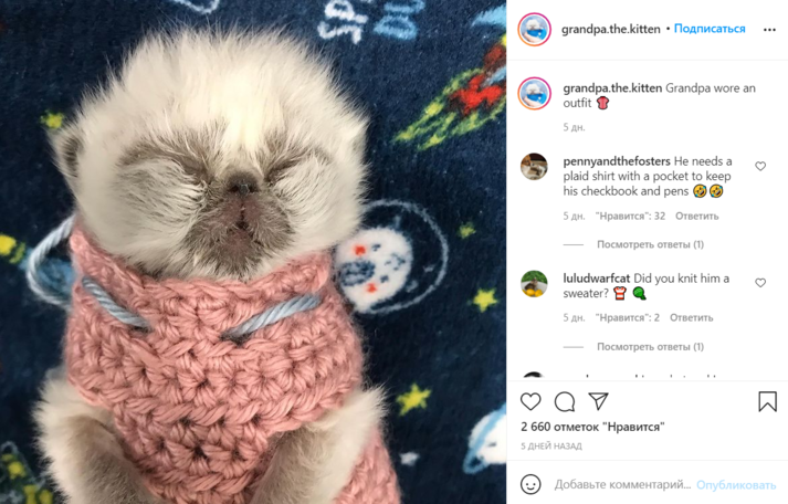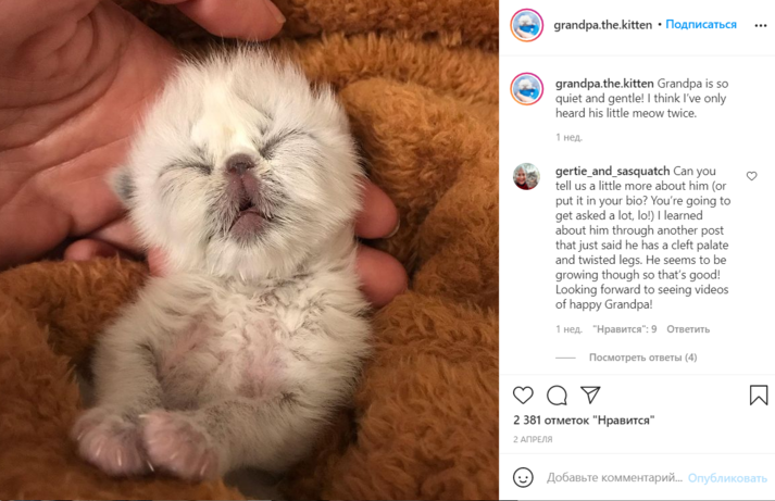 История Дедушки уже успела стать вирусной. Котику даже завели отдельный аккаунт в Instagram, и за состоянием его здоровья следят более 8,5 тысяч преданных подписчиков