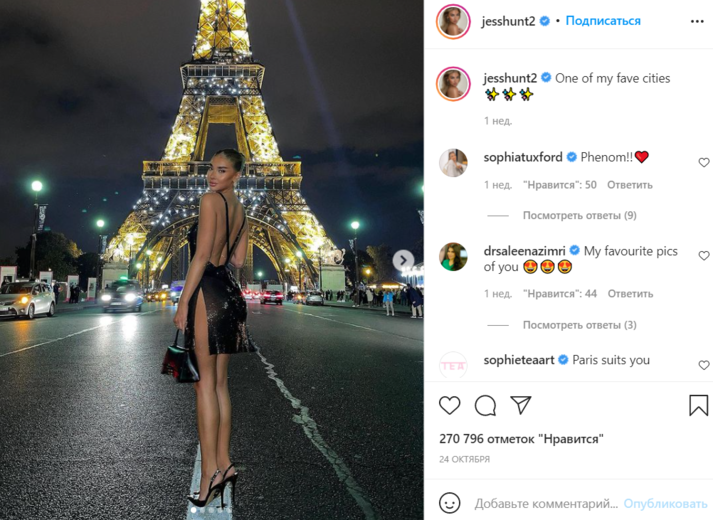 На фотографиях, которыми поделилась Джесс, девушка позирует в столице Франции. Джесс стоит прямо посреди оживленной дороги на Йенском мосту. Он соединяет между собой площадку перед Эйфелевой башней с правым берегом Сены.
