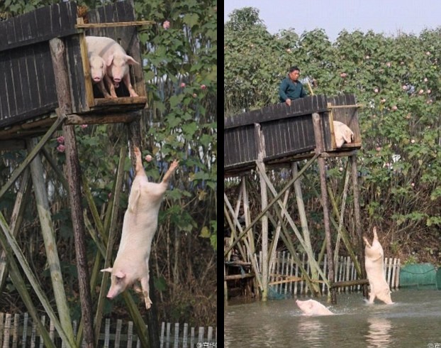Китайский фермер научил свиней прыгать с вышки и плавать в водоеме