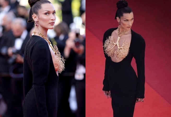 Американская супермодель Белла Хадид появилась на престижном мероприятии в облегающем черном платье из новой коллекции бренда Schiaparelli, в инстаграме которого опубликовали эффектные кадры. Особенностью наряда стал глубокий вырез, обнажающий грудь.