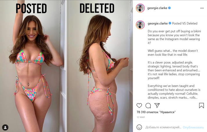 «Фотографии сделаны с разницей в пару секунд, единственное различие в том, что на первом кадре я позирую, а на втором сижу без напряжения», — подписала публикацию модель, которая набрала больше 30 тысяч лайков. В описаниях к другим постам Кларк объясняет, что размещает снимки своего тела со всеми недостатками, чтобы раскрыть подписчикам правду об обманчивых снимках, которые блогеры публикуют в своих аккаунтах в соцсетях.