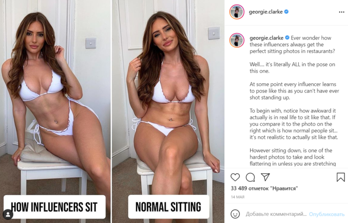 Телезвезда Джорджи Кларк (Georgie Clarke) регулярно публикует коллажи, на которых демонстрирует, как ее фигура выглядит с разных ракурсов съемки. Так, например, на одном из кадров она показала, как с помощью правильной позы и освещения добиться идеальной кожи. Манекенщица сфотографировалась в зеркало в нижнем белье с ровной осанкой, повернувшись спиной к камере.