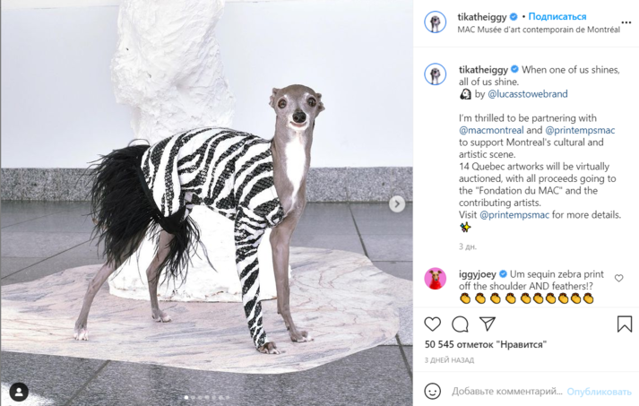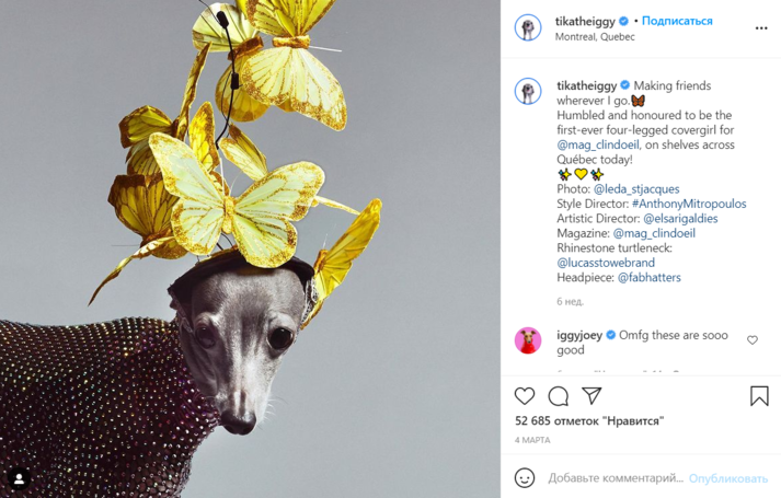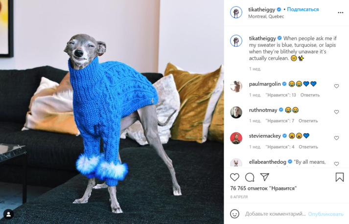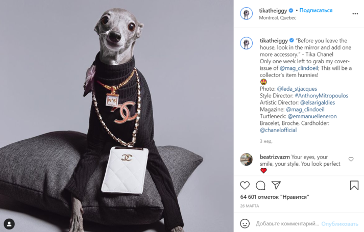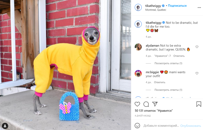 Левретке уже 10 лет, и все это время ее хозяин выкладывал фотографии Тики в стильных нарядах. В 2016-м его друзья не выдержали и заявили, что на личной странице не должно быть так много портретов собаки. Так у Тики появился собственный инстаграм. И сейчас на него подписано уже более миллиона человек!