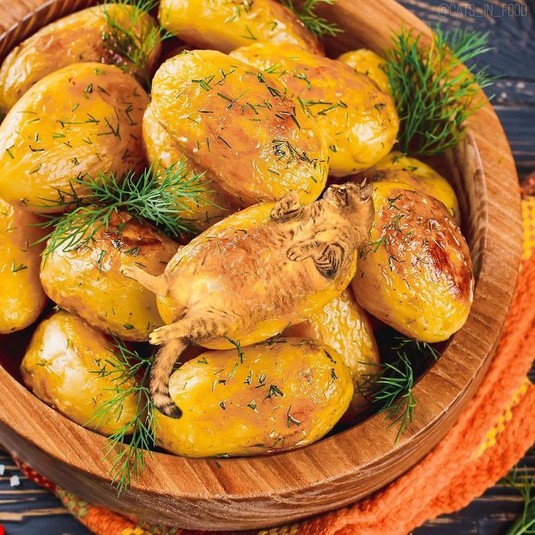 По словам девушки, в конце января она придумала и запустила страницу в Instagram под названием Cats In Food, где публикует фото с «дорисованными» к еде мордочками разных котов.