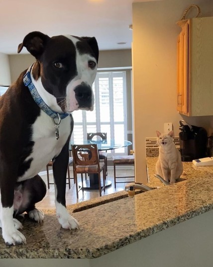 Спасенный питбуль считает себя котом и отказывается верить, что он — пес