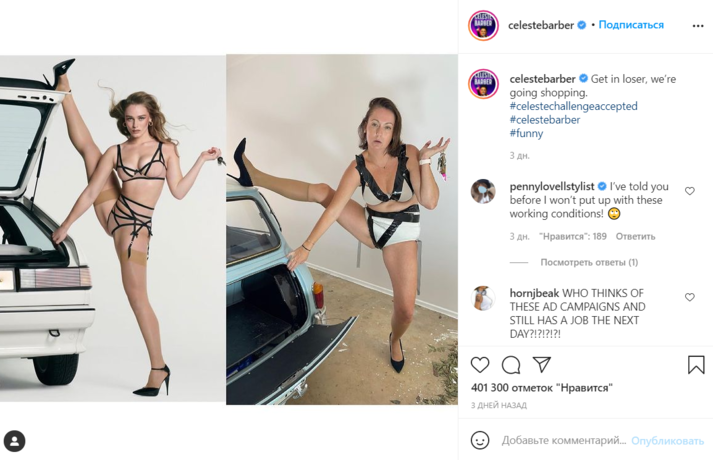 Но, несмотря на все различия с моделью, кадр юмористки вызывает намного больше эмоций. Стоя в гольфах на одной ноге, женщина едва сохраняет равновесие, но продолжает держать серьезное лицо. Дизайн бикини также повторен «идеально». В версии Барбер он стал белым, а черные ленты заменил скотч. За полдня пост оценило больше 300 тысяч человек. Впрочем, ничего нового — недавняя фотография Селесты в образе Беллы Хадид набрала больше полумиллиона лайков.