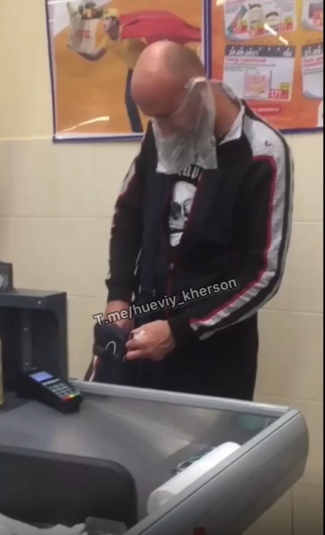 В одном из супермаркетов Херсона сняли на видео покупателя в креативной «маске». Соответствующий видеоролик опубликовал местный Telegram-канал.