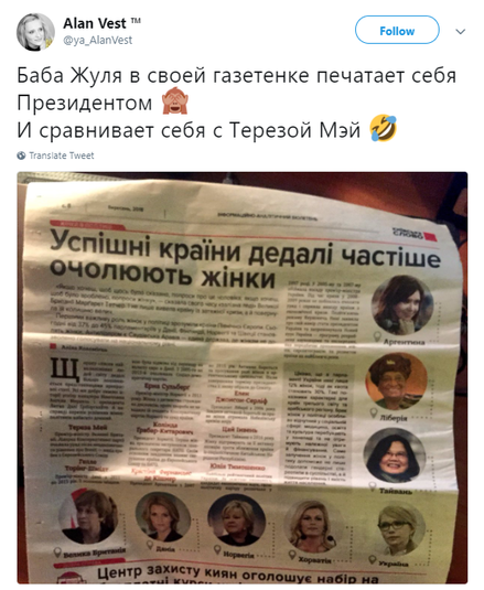 Отмечается, что в сети показали фотографию одной из страниц газеты «Киевское слово», где опубликована статья под названием «Успешные страны все чаще возглавляют женщины», - там Тимошенко стоит в одном ряду с премьером Британии Терезой Мэй, экс-премьером Дании Хелле Торнинг-Шмитт, премьером Норвегии Эрной Сульберг, президентом Хорватии Колиндой Грабар-Китарович, экс-президентом Аргентины Кристиной Фернандес де Киршнер, экс-президентом Либерии Элен Джонсон-Серлиф, президентом Китая Цай Инвэнь. Соответствующее фото было опубликовано на странице в Twitter Alan Vest.