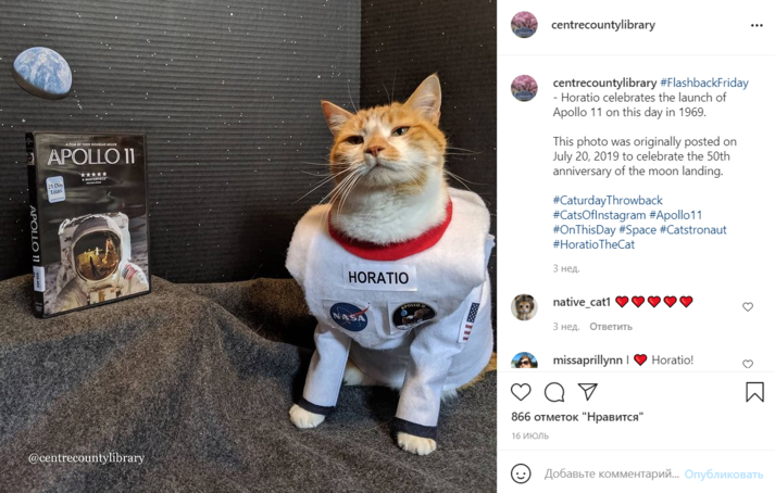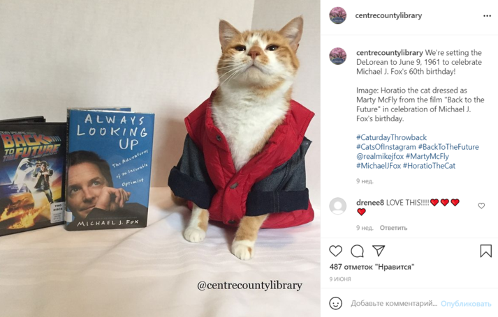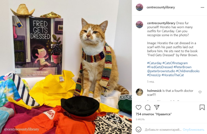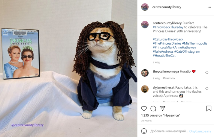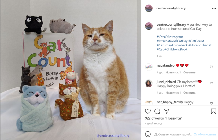 Публичная библиотека Center County Library, расположенная в Беллефонте (штат Пенсильвания, США), имеет огромное количество книг для взрослых и детей. Но есть то, что отличает эту библиотеку от всех остальных: в ней работает необычный сотрудник — очаровательный рыжий кот по кличке Горацио.