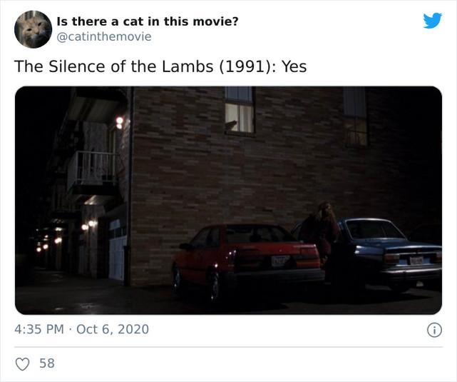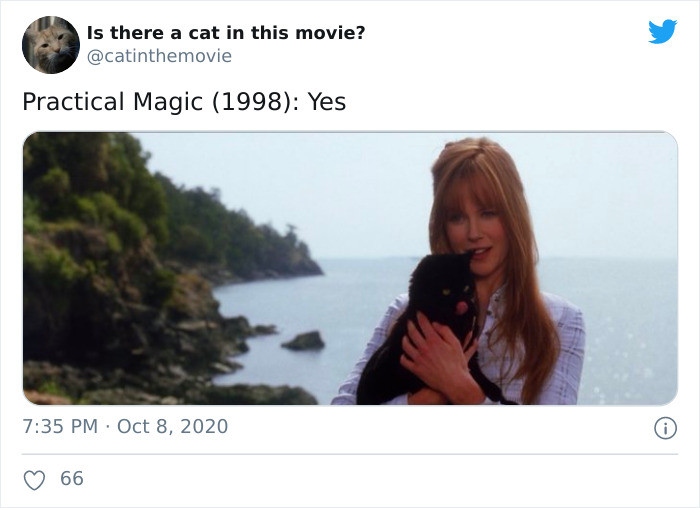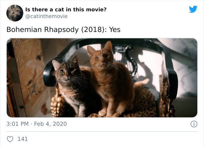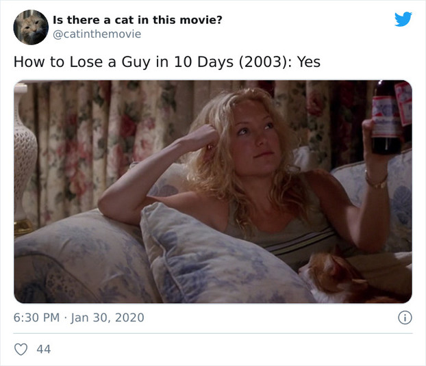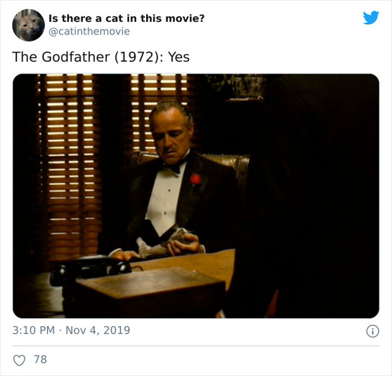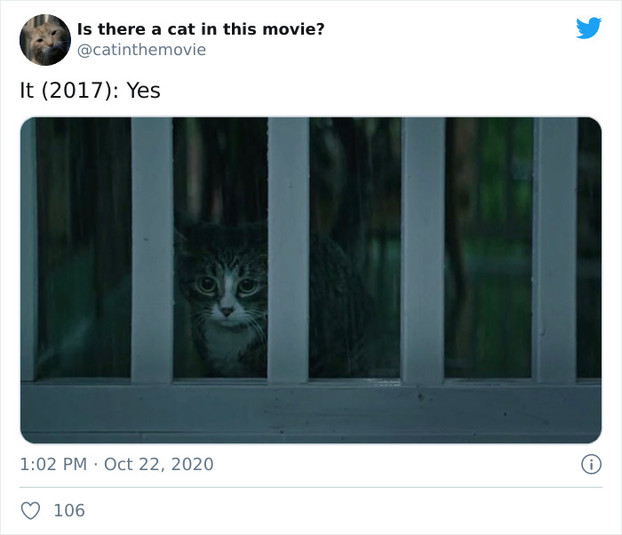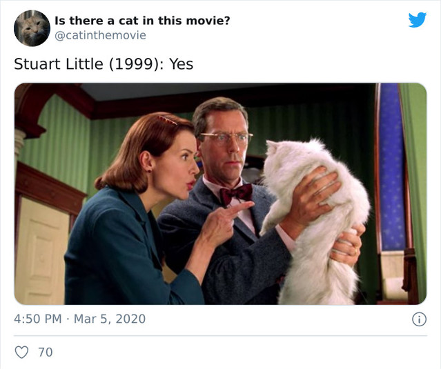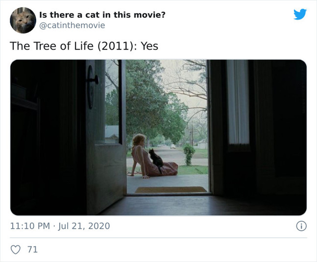 В твиттере есть аккаунт под названием Is there a cat in this movie?, и он отвечает на важный вопрос — увидит ли зритель кота в (том или ином) фильме?