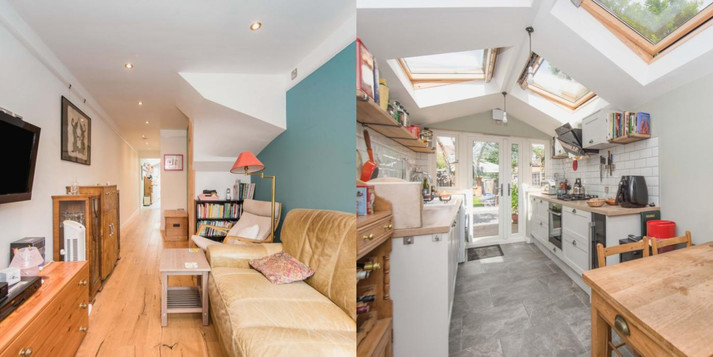 Хоть в ширину домишка всего 2,4 м, в длину он больше 15 метров на первом этаже! При входе через парадную дверь гость сразу же попадает в гостиную, растянувшуюся на пять метров вперед. Дальше – небольшой коридор и очаровательная кухня с мансардными окнами. Недостатка света будущие жильцы точно не почувствуют.