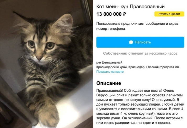 В России жительница Краснодара выставила на продажу своего кота с религиозными убеждениями. Котик, заявленный как мейн-кун, соблюдает все посты и пропускает в дом только верующих людей, пишет «Блокнот Краснодар».