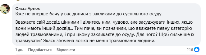 Допис Лесі Литвиненко спровокував безпрецедентну хвилю негативних коментарів та обурення серед користувачів соціальних мереж. Користувачі масово висловлювали незгоду з категоричною та, на їхню думку, осудливою позицією Лесі Литвиненко.