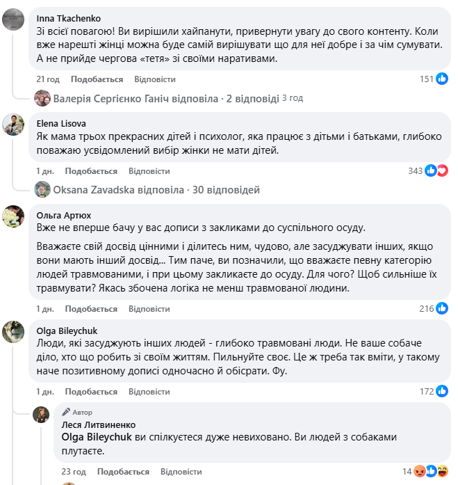 Засновниця національної освітньої платформи «Всеосвіта» Леся Литвиненко висловила свою категоричну позицію щодо руху чайлдфрі (людей, що свідомо відмовляються від дітей). Вона назвала таких людей «травмованими кимось» і закликала засуджувати блогерів, які просувають подібні наративи. Проте, публікація цього допису спровокувала безпрецедентну хвилю негативних коментарів та обурення серед користувачів соціальних мереж. Про це повідомляє «Главком» з посиланням на допис Лесі Литвиненко.
