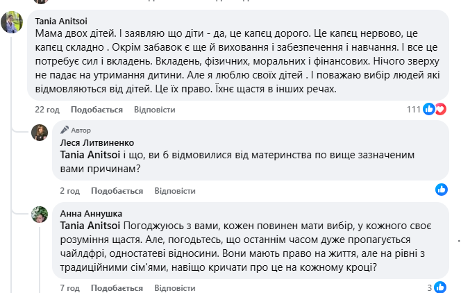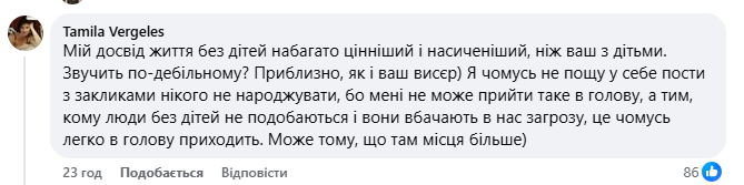 Багато коментаторів наголошували, що рішення мати чи не мати дітей є глибоко особистим вибором кожної людини, і ніхто не має права засуджувати такі рішення або називати людей «травмованими» через їхні життєві обставини.