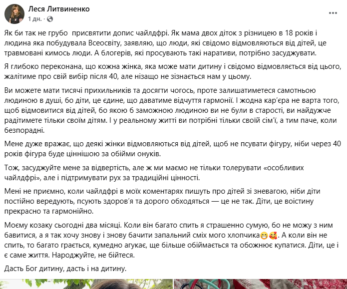 Леся Литвиненко закликала не лише толерувати «особливих чайлдфрі», а й підтримувати рух за традиційні цінності. Вона також висловила неприйняття зневажливих коментарів щодо дітей, які часто лунають від прихильників чайлдфрі, мовляв, діти «вередують, псують здоров'я та дорого обходяться». На її думку, «це не так. Діти – це воістину прекрасно та гармонійно».