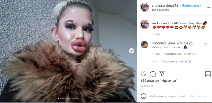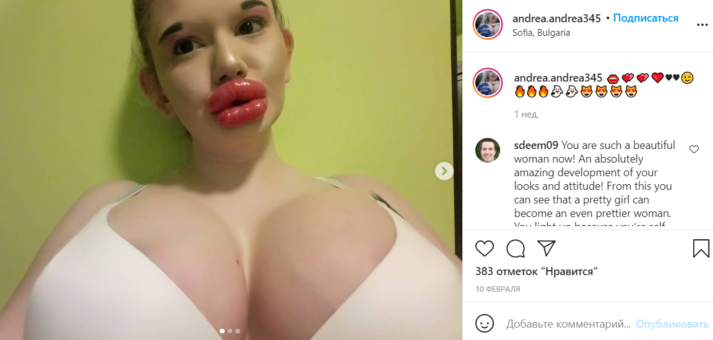 Андреа начала свое бьюти-перевоплощение в 2018 году. За это время она потратила на свою внешность десятки тысяч фунтов. Яркая внешность Ивановой вызывает бурную реакцию в соцсетях. Многие считают девушку красоткой, а другие просят ее остановиться в своем стремлении к совершенству.