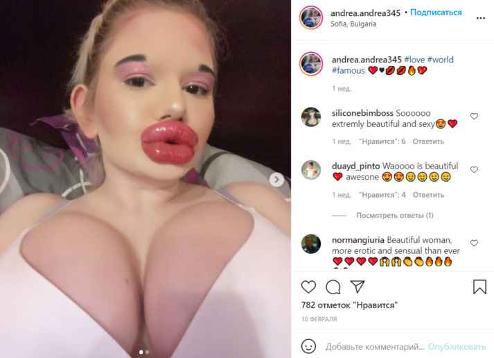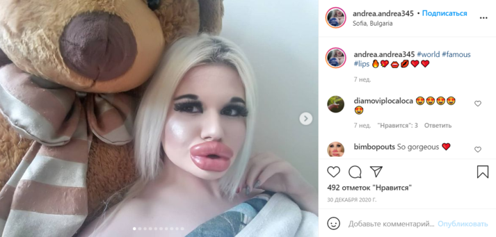 Обладательница самых больших губ в мире, 22-летняя модель Андреа Иванова, считает себя живым воплощением куклы Барби. Она постоянно усовершенствует свою внешность. Ради того, чтобы быть привлекательной, жительница Софии часто обращается за помощью к пластическим хирургам и косметологам. Ей сделали более 20 инъекций гиалуроновой кислоты в губы. Кроме того, она подкорректировала изгибы своего тела.