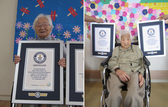 Японки Умэмо Сумияма и Коумэ Кодама, которым 1 сентября исполнилось 107 лет и 300 дней, признаны самыми старыми из ныне живущих близнецов женского пола и самыми старыми близнецами в мире. Об этом сообщает сайт Книги рекордов Гиннесса.