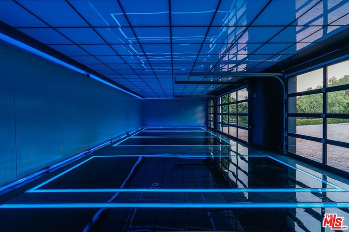Другие удобства включают большой бассейн, спа, просторный офис, винную комнату, фитнес-студию, домашний кинотеатр, футуристичный гараж на пять автомобилей и баскетбольную площадку. Также на территории есть гостевой дом на две спальни.