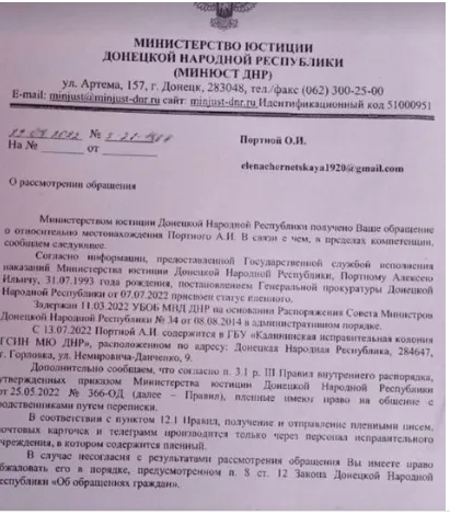 Жінка показала документ, де йдеться про те, що Олексій Портний перебуває в виправній колонії міста Горлівка Донецької області. Його затримали в Маріуполі 11 березня, звідки привезли у так звану «ДНР».