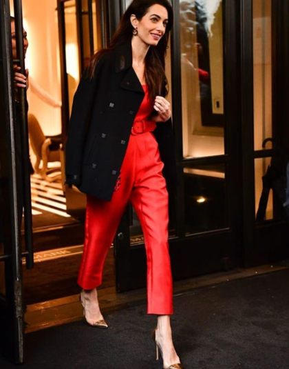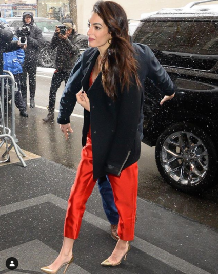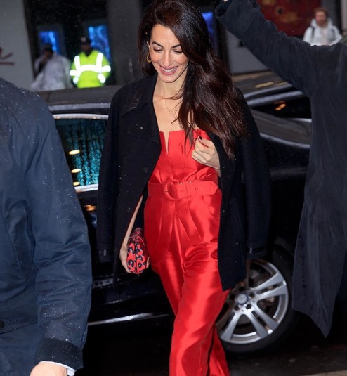 У дверей отеля жена Джорджа Клуни появилась в сопровождении помощника, который нес два пакета с подарками для будущего первенца герцога и герцогини Сассекских. Назло летящему снегу Амаль в этот день надела легкий комбинезон ярко-красного цвета, черный пиджак и туфли золотистого оттенка.
