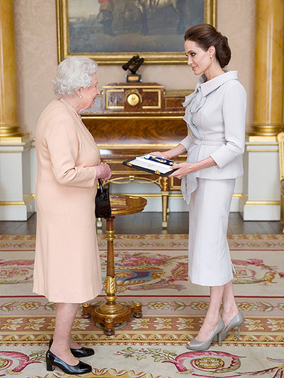 Пути королевы Великобритании Елизаветы II и Анджелины Джоли пересекались однажды - в октябре 2014 года на закрытом приеме в Букингемском дворце, когда Ее Величество наградила голливудскую актрису титулом кавалерственной дамы.