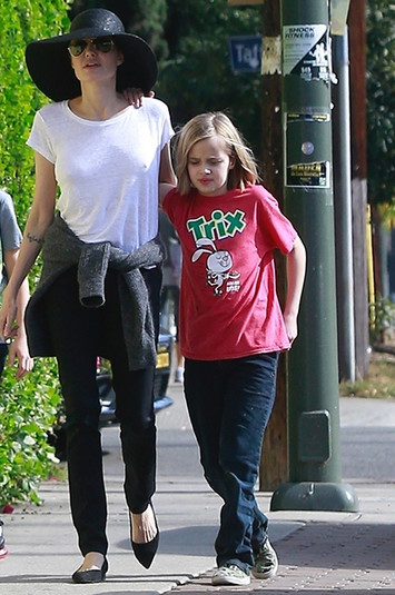 Одеты и актриса, и ее дети были очень комфортно. Сама звезда появилась на улице в белой футболке, черных узких джинсах, остроносых балетках, широкополой шляпе и солнечных очках (то ли Джоли хотела остаться неузнанной, то ли эти аксессуары лишь были деталями ее образа). На поясе у нее был завязан темно-серый свитер — видимо, на тот случай, если станет прохладно.