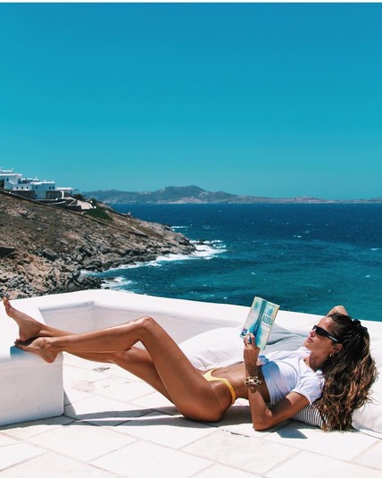 С собой на остров модель так же прихватила множество купальников, короткие топы и пестрые юбки в пол для прогулок по узким улочкам Миконоса.