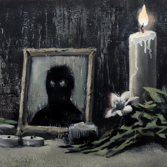 На кадре виден траурный портрет с темной фигурой. Американский флаг, висящий над изображением, постепенно начинает гореть, подожженный пламенем от свечи.