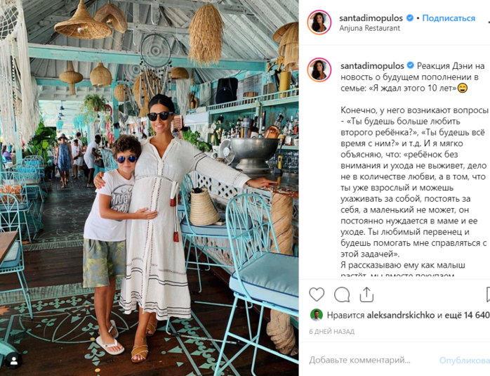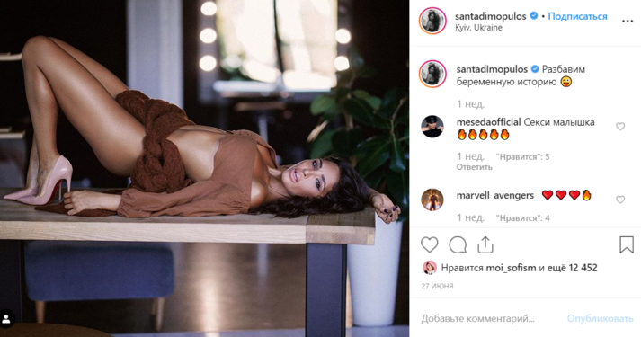 32-летняя украинская певица и экс-«ВиаГра» Санта Димопулос ждет второго ребенка. Певица показала свою мотивацию, которая поможет ей похудеть после родов. Артистка опубликовала фото в купальнике, сделанное до беременности. На снимке звезда подняла руки вверх, придерживая волосы. При этом она демонстрировала узкую талию и женственные формы.