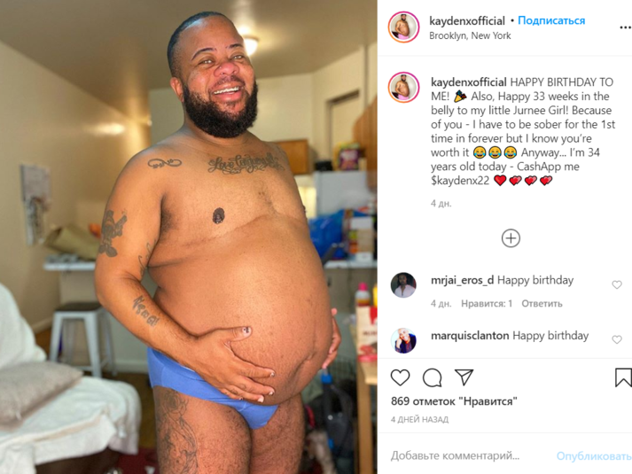 Кайден заверил, что не хочет вызвать сочувствие к себе, а пытается показать, что это непросто. Американец добавил, что окружающие даже не подозревают о его беременности. Все принимают его за мужчину с лишним весом.